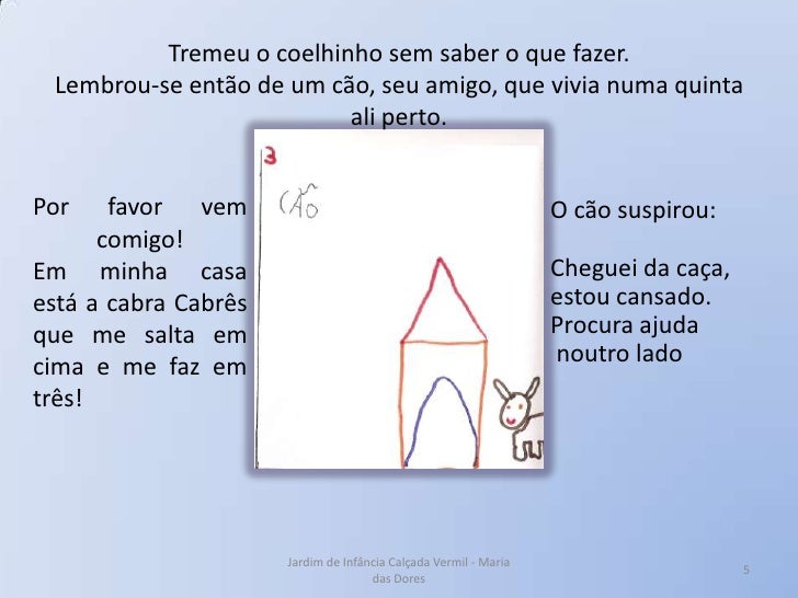 6. 6. Tremeu o coelhinho sem saber o que fazer.Lembrou-se então de um cão, seu amigo, que vivia numa quinta ali perto.<br />Por favor vem comigo!Em minha casa está a cabra Cabrêsque me salta em cima e me faz em três!<br />O cão suspirou:<br />Cheguei da caça, <br />estou cansado.<br />Procura ajuda<br /> noutro lado<br />5<br />Jardim de Infância Calçada Vermil - Maria das Dores<br />