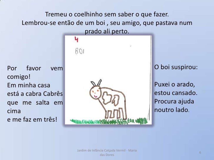 7. 7. Tremeu o coelhinho sem saber o que fazer.Lembrou-se então de um boi , seu amigo, que pastava num prado ali perto.<br />O boi suspirou:<br />Puxei o arado,<br />estou cansado.<br />Procura ajuda<br />noutro lado.<br />Por favor vem comigo!<br />Em minha casa <br />está a cabra Cabrês<br />que me salta em cima <br />e me faz em três!<br />6<br />Jardim de Infância Calçada Vermil - Maria das Dores<br />