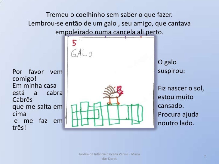 8. 8. Tremeu o coelhinho sem saber o que fazer.Lembrou-se então de um galo , seu amigo, que cantava empoleirado numa cancela ali perto.<br />O galo suspirou:Fiz nascer o sol, estou muito cansado.Procura ajuda noutro lado.<br />Por favor vem comigo!<br />Em minha casa <br />está a cabra Cabrês<br />que me salta em cima<br /> e me faz em três!<br />7<br />Jardim de Infância Calçada Vermil - Maria das Dores<br />