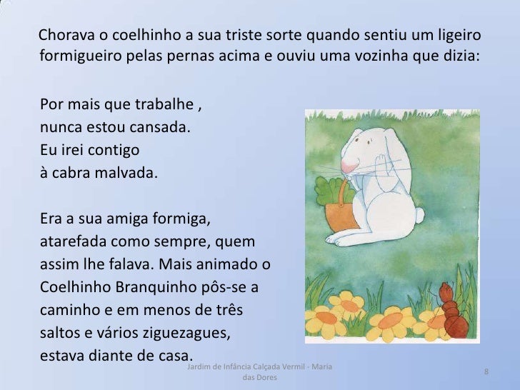 9. 9. Chorava o coelhinho a sua triste sorte quando sentiu um ligeiro formigueiro pelas pernas acima e ouviu uma vozinha que dizia:<br />Por mais que trabalhe ,<br />nunca estou cansada.<br />Eu irei contigo<br />à cabra malvada.<br />Era a sua amiga formiga,<br />atarefada como sempre, quem<br />assim lhe falava. Mais animado o<br />Coelhinho Branquinho pôs-se a <br />caminho e em menos de três <br />saltos e vários ziguezagues, <br />estava diante de casa.<br />8<br />Jardim de Infância Calçada Vermil - Maria das Dores<br />