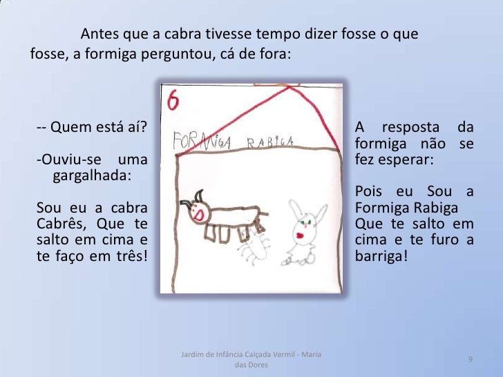 11. 11. Ouviu-se uma gargalhada:</li></ul>Sou eu a cabra Cabrês, Que te salto em cima e te faço em três!<br />A resposta da formiga não se fez esperar:<br />Pois eu Sou a Formiga Rabiga<br />Que te salto em cima e te furo a barriga!<br />9<br />Jardim de Infância Calçada Vermil - Maria das Dores<br />