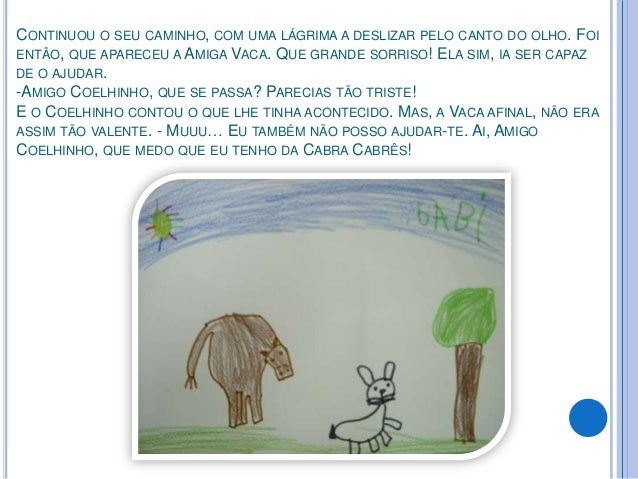 6. 6. CONTINUOU O SEU CAMINHO, COM UMA LÁGRIMA A DESLIZAR PELO CANTO DO OLHO. FOIENTÃO, QUE APARECEU A AMIGA VACA. QUE GRANDE SORRISO! ELA SIM, IA SER CAPAZDE O AJUDAR.-AMIGO COELHINHO, QUE SE PASSA? PARECIAS TÃO TRISTE!E O COELHINHO CONTOU O QUE LHE TINHA ACONTECIDO. MAS, A VACA AFINAL, NÃO ERAASSIM TÃO VALENTE. - MUUU… EU TAMBÉM NÃO POSSO AJUDAR-TE. AI, AMIGOCOELHINHO, QUE MEDO QUE EU TENHO DA CABRA CABRÊS!