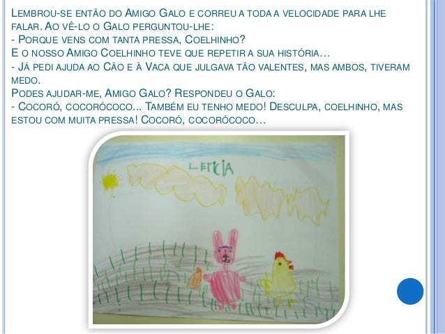 7. 7. LEMBROU-SE ENTÃO DO AMIGO GALO E CORREU A TODA A VELOCIDADE PARA LHEFALAR. AO VÊ-LO O GALO PERGUNTOU-LHE:- PORQUE VENS COM TANTA PRESSA, COELHINHO?E O NOSSO AMIGO COELHINHO TEVE QUE REPETIR A SUA HISTÓRIA…- JÁ PEDI AJUDA AO CÃO E À VACA QUE JULGAVA TÃO VALENTES, MAS AMBOS, TIVERAMMEDO.PODES AJUDAR-ME, AMIGO GALO? RESPONDEU O GALO:- COCORÓ, COCORÓCOCO... TAMBÉM EU TENHO MEDO! DESCULPA, COELHINHO, MASESTOU COM MUITA PRESSA! COCORÓ, COCORÓCOCO…