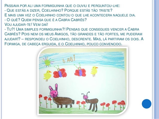 8. 8. PASSAVA POR ALI UMA FORMIGUINHA QUE O OUVIU E PERGUNTOU-LHE:- QUE ESTÁS A DIZER, COELHINHO? PORQUE ESTÁS TÃO TRISTE?E MAIS UMA VEZ O COELHINHO CONTOU O QUE LHE ACONTECERA NAQUELE DIA.- O QUÊ? QUEM PENSA QUE É A CABRA CABRÊS?VOU AJUDAR-TE! VEM DAÍ!- TU?! UMA SIMPLES FORMIGUINHA?! PENSAS QUE CONSEGUES VENCER A CABRACABRÊS? POIS NEM OS MEUS AMIGOS, TÃO GRANDES E TÃO FORTES, ME PUDERAMAJUDAR!? – RESPONDEU O COELHINHO, DESCRENTE. MAS, LÁ PARTIRAM OS DOIS. AFORMIGA, DE CABEÇA ERGUIDA, E O COELHINHO, POUCO CONVENCIDO.