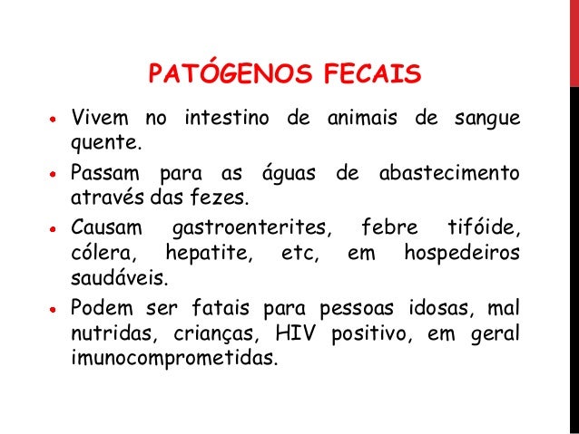 12. 12. PATÓGENOS FECAIS Vivem no intestino de animais de sangue quente. Passam para as águas de abastecimento através das fezes. Causam gastroenterites, febre tifóide, cólera, hepatite, etc, em hospedeiros saudáveis. Podem ser fatais para pessoas idosas, mal nutridas, crianças, HIV positivo, em geral imunocomprometidas.