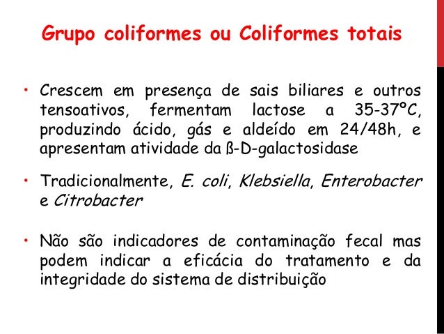13. 13. Grupo coliformes ou Coliformes totais • Crescem em presença de sais biliares e outros tensoativos, fermentam lactose a 35-37ºC, produzindo ácido, gás e aldeído em 24/48h, e apresentam atividade da ß-D-galactosidase • Tradicionalmente, E. coli, Klebsiella, Enterobacter e Citrobacter • Não são indicadores de contaminação fecal mas podem indicar a eficácia do tratamento e da integridade do sistema de distribuição