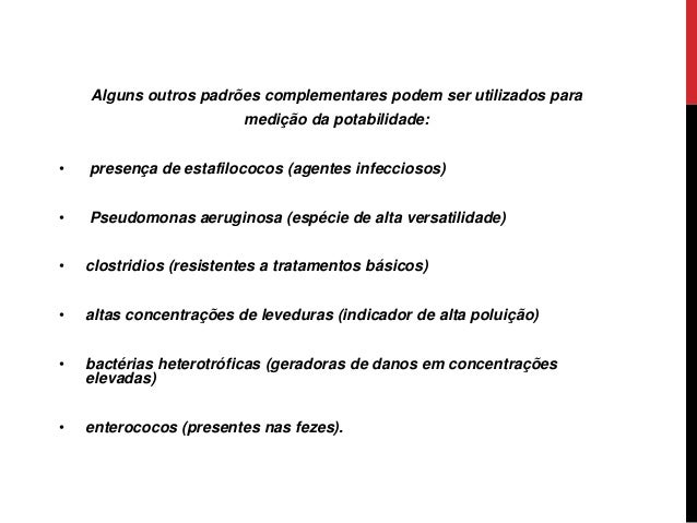 17. 17. Alguns outros padrões complementares podem ser utilizados para medição da potabilidade: • presença de estafilococos (agentes infecciosos) • Pseudomonas aeruginosa (espécie de alta versatilidade) • clostridios (resistentes a tratamentos básicos) • altas concentrações de leveduras (indicador de alta poluição) • bactérias heterotróficas (geradoras de danos em concentrações elevadas) • enterococos (presentes nas fezes).