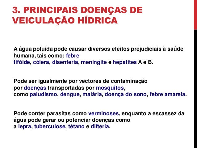 18. 18. 3. PRINCIPAIS DOENÇAS DE VEICULAÇÃO HÍDRICA A água poluída pode causar diversos efeitos prejudiciais à saúde humana, tais como: febre tifóide, cólera, disenteria, meningite e hepatites A e B. Pode ser igualmente por vectores de contaminação por doenças transportadas por mosquitos, como paludismo, dengue, malária, doença do sono, febre amarela. Pode conter parasitas como verminoses, enquanto a escassez da água pode gerar ou potenciar doenças como a lepra, tuberculose, tétano e difteria.