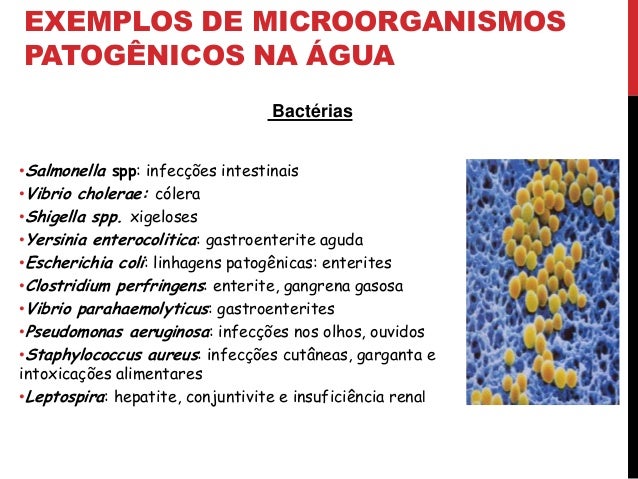 19. 19. EXEMPLOS DE MICROORGANISMOS PATOGÊNICOS NA ÁGUA Bactérias •Salmonella spp: infecções intestinais •Vibrio cholerae: cólera •Shigella spp. xigeloses •Yersinia enterocolitica: gastroenterite aguda •Escherichia coli: linhagens patogênicas: enterites •Clostridium perfringens: enterite, gangrena gasosa •Vibrio parahaemolyticus: gastroenterites •Pseudomonas aeruginosa: infecções nos olhos, ouvidos •Staphylococcus aureus: infecções cutâneas, garganta e intoxicações alimentares •Leptospira: hepatite, conjuntivite e insuficiência renal