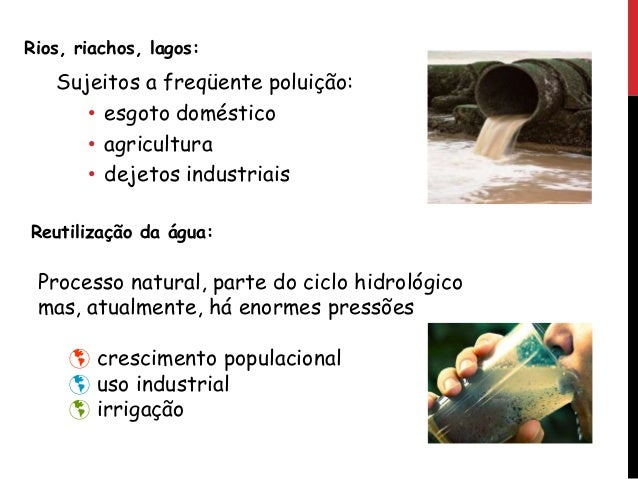 2. 2. Rios, riachos, lagos: Sujeitos a freqüente poluição: • esgoto doméstico • agricultura • dejetos industriais Reutilização da água: Processo natural, parte do ciclo hidrológico mas, atualmente, há enormes pressões  crescimento populacional  uso industrial  irrigação