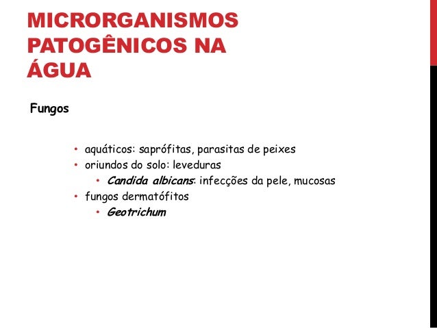 20. 20. MICRORGANISMOS PATOGÊNICOS NA ÁGUA Fungos • aquáticos: saprófitas, parasitas de peixes • oriundos do solo: leveduras • Candida albicans: infecções da pele, mucosas • fungos dermatófitos • Geotrichum