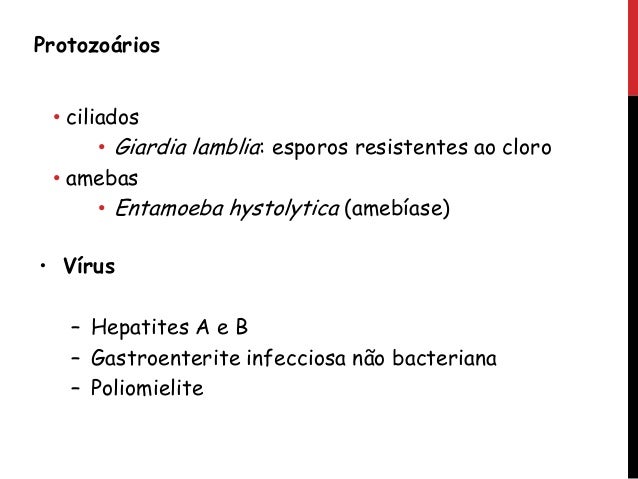 21. 21. Protozoários • ciliados • Giardia lamblia: esporos resistentes ao cloro • amebas • Entamoeba hystolytica (amebíase) • Vírus – Hepatites A e B – Gastroenterite infecciosa não bacteriana – Poliomielite