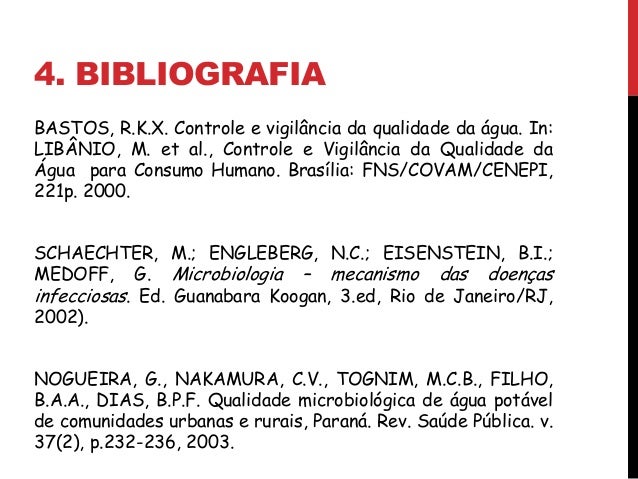 22. 22. 4. BIBLIOGRAFIA BASTOS, R.K.X. Controle e vigilância da qualidade da água. In: LIBÂNIO, M. et al., Controle e Vigilância da Qualidade da Água para Consumo Humano. Brasília: FNS/COVAM/CENEPI, 221p. 2000. SCHAECHTER, M.; ENGLEBERG, N.C.; EISENSTEIN, B.I.; MEDOFF, G. Microbiologia – mecanismo das doenças infecciosas. Ed. Guanabara Koogan, 3.ed, Rio de Janeiro/RJ, 2002). NOGUEIRA, G., NAKAMURA, C.V., TOGNIM, M.C.B., FILHO, B.A.A., DIAS, B.P.F. Qualidade microbiológica de água potável de comunidades urbanas e rurais, Paraná. Rev. Saúde Pública. v. 37(2), p.232-236, 2003.