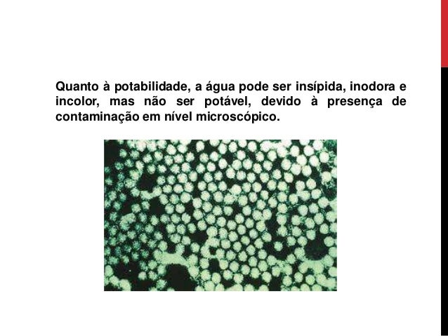 3. 3. Quanto à potabilidade, a água pode ser insípida, inodora e incolor, mas não ser potável, devido à presença de contaminação em nível microscópico.