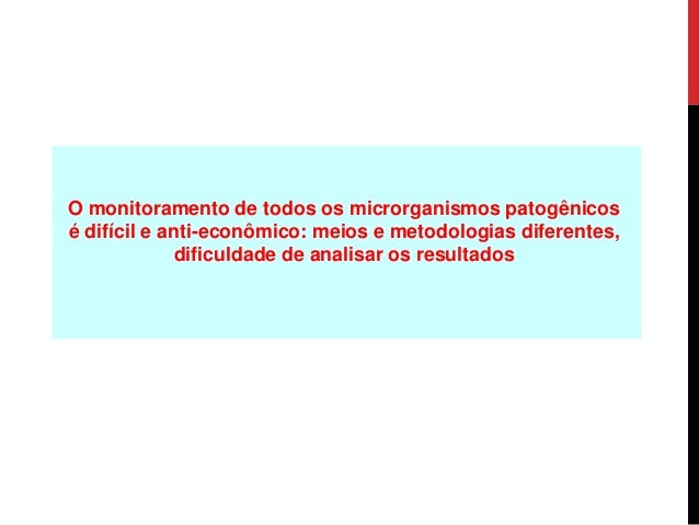 5. 5. O monitoramento de todos os microrganismos patogênicos é difícil e anti-econômico: meios e metodologias diferentes, dificuldade de analisar os resultados