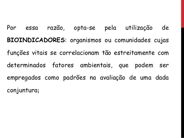 6. 6. Por essa razão, opta-se pela utilização de BIOINDICADORES: organismos ou comunidades cujas funções vitais se correlacionam tão estreitamente com determinados fatores ambientais, que podem ser empregados como padrões na avaliação de uma dada conjuntura;