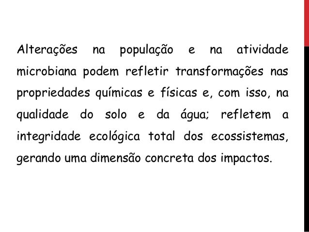 7. 7. Alterações na população e na atividade microbiana podem refletir transformações nas propriedades químicas e físicas e, com isso, na qualidade do solo e da água; refletem a integridade ecológica total dos ecossistemas, gerando uma dimensão concreta dos impactos.