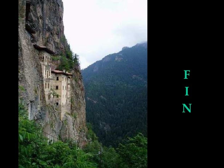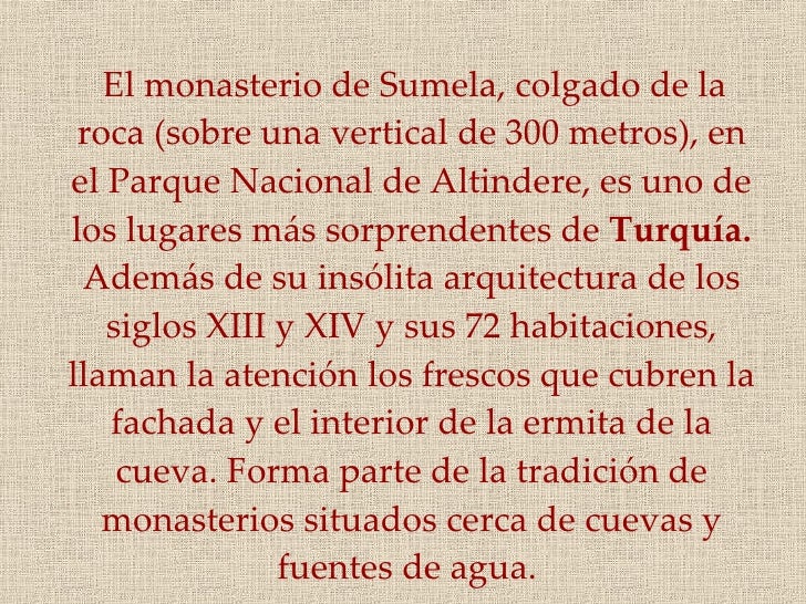 2. 2. <ul><li>El monasterio de Sumela, colgado de la roca (sobre una vertical de 300 metros), en el Parque Nacional de Altindere, es uno de los lugares más sorprendentes de Turquía. Además de su insólita arquitectura de los siglos XIII y XIV y sus 72 habitaciones, llaman la atención los frescos que cubren la fachada y el interior de la ermita de la cueva. Forma parte de la tradición de monasterios situados cerca de cuevas y fuentes de agua. </li></ul>