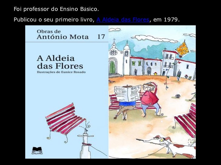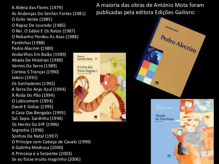 5. 5. A Aldeia das Flores (1979) A maioria das obras de António Mota foramAs Andanças Do Senhor Fortes (1981) publicadas pela editora Edições Gailivro:O Grilo Verde (1985)O Rapaz De Louredo (1985)O Rei. O Sábio E Os Ratos (1987)O Rebanho Perdeu As Asas (1988)Pardinhas (1988)Pedro Alecrim (1989)Andarilhos Em Baião (1989)Abada De Histórias (1989)Ventos Da Serra (1989)Corteia S Tranças (1990)Jaleco (1991)Os Sonhadores (1992)A Terra Do Anjo Azul (1994)À Roda Do Pão (1994)O Lobisomem (1994)David E Golias (1995)A Casa Das Bengalas (1995)Sal. Sapo. Sardinha (1996)Os Heróis Do 6ºF (1996)Segredos (1996)Sonhos De Natal (1997)O Príncipe com Cabeça de Cavalo (1999)A Galinha Medrosa (2000)A Princesa e a Serpente (2003)Se eu fosse muito magrinho (2006)