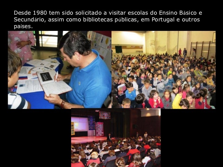 4. 4. Desde 1980 tem sido solicitado a visitar escolas do Ensino Básico eSecundário, assim como bibliotecas públicas, em Portugal e outrospaíses.