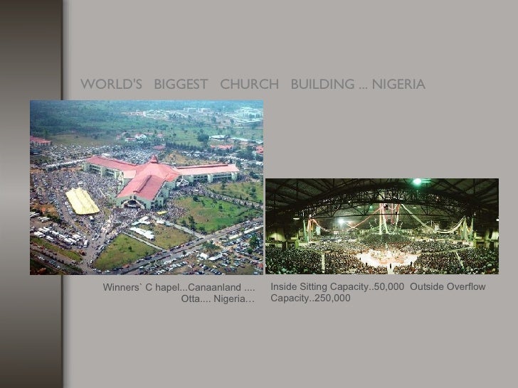 15. 15. WORLD'S   BIGGEST   CHURCH   BUILDING ... NIGERIA Winners` C hapel...Canaanland .... Otta.... Nigeria … Inside Sitting Capacity..50,000 Outside Overflow Capacity..250,000