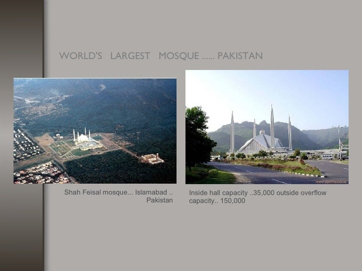 16. 16. WORLD'S   LARGEST   MOSQUE ...... PAKISTAN Shah Feisal mosque... Islamabad .. Pakistan Inside hall capacity ..35,000 outside overflow capacity.. 150,000