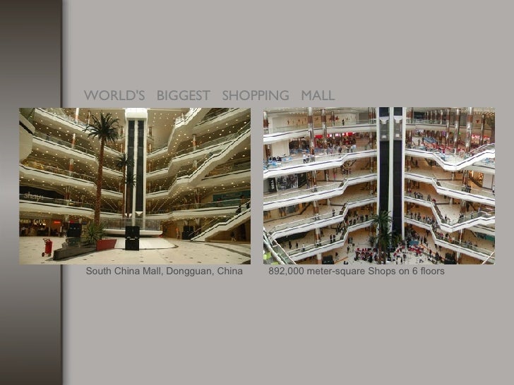 WORLD'S   BIGGEST   SHOPPING   MALL  South China Mall, Dongguan, China  892,000 meter-square Shops on 6 floors
