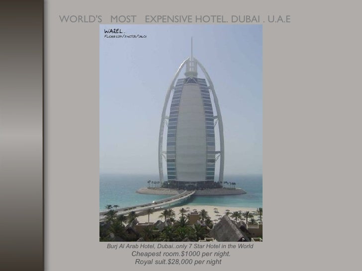 22. 22. WORLD'S MOST EXPENSIVE HOTEL. DUBAI . U.A.E Burj Al Arab Hotel, Dubai..only 7 Star Hotel in the World Cheapest room.$1000 per night. Royal suit.$28,000 per night