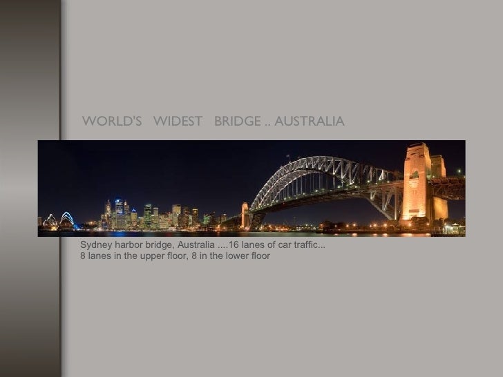 7. 7. WORLD'S   WIDEST   BRIDGE .. AUSTRALIA Sydney harbor bridge, Australia ....16 lanes of car traffic... 8 lanes in the upper floor, 8 in the lower floor