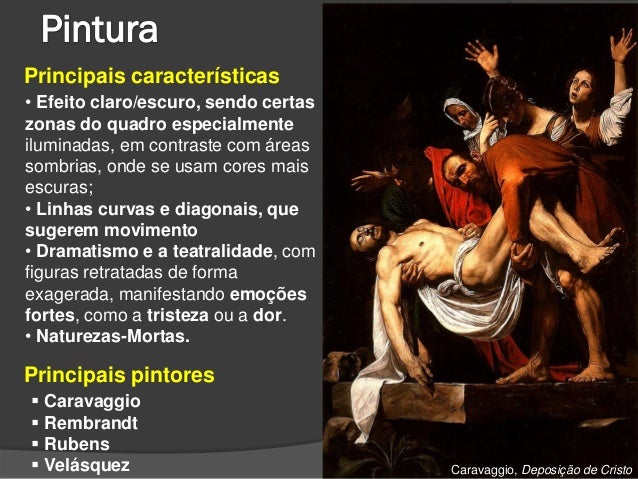 13. 13. Principais características• Efeito claro/escuro, sendo certaszonas do quadro especialmenteiluminadas, em contraste com áreassombrias, onde se usam cores maisescuras;• Linhas curvas e diagonais, quesugerem movimento• Dramatismo e a teatralidade, comfiguras retratadas de formaexagerada, manifestando emoçõesfortes, como a tristeza ou a dor.• Naturezas-Mortas.Principais pintores Caravaggio Rembrandt Rubens Velásquez Caravaggio, Deposição de Cristo
