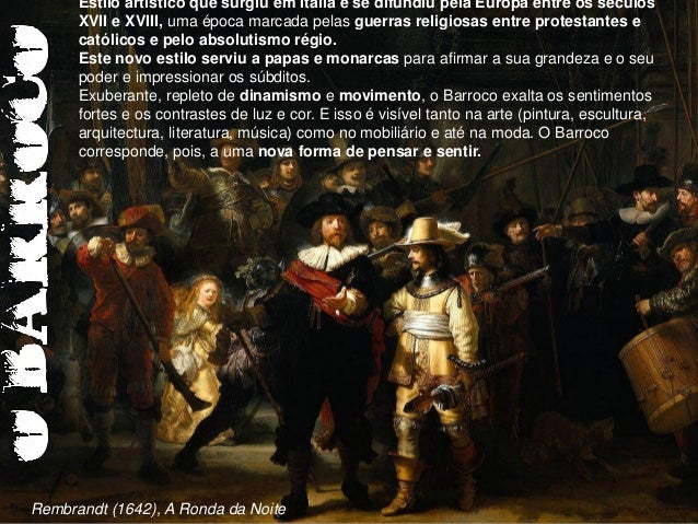 2. 2. Estilo artístico que surgiu em Itália e se difundiu pela Europa entre os séculos XVII e XVIII, uma época marcada pelas guerras religiosas entre protestantes e católicos e pelo absolutismo régio. Este novo estilo serviu a papas e monarcas para afirmar a sua grandeza e o seu poder e impressionar os súbditos. Exuberante, repleto de dinamismo e movimento, o Barroco exalta os sentimentos fortes e os contrastes de luz e cor. E isso é visível tanto na arte (pintura, escultura, arquitectura, literatura, música) como no mobiliário e até na moda. O Barroco corresponde, pois, a uma nova forma de pensar e sentir.Rembrandt (1642), A Ronda da Noite