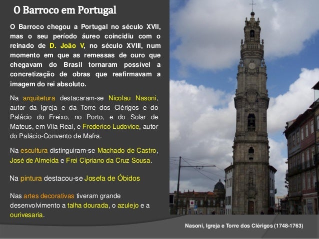 29. 29. O Barroco chegou a Portugal no século XVII,mas o seu período áureo coincidiu com oreinado de D. João V, no século XVIII, nummomento em que as remessas de ouro quechegavam do Brasil tornaram possível aconcretização de obras que reafirmavam aimagem do rei absoluto.Na arquitetura destacaram-se Nicolau Nasoni,autor da Igreja e da Torre dos Clérigos e doPalácio do Freixo, no Porto, e do Solar deMateus, em Vila Real, e Frederico Ludovice, autordo Palácio-Convento de Mafra.Na escultura distinguiram-se Machado de Castro,José de Almeida e Frei Cipriano da Cruz Sousa.Na pintura destacou-se Josefa de ÓbidosNas artes decorativas tiveram grandedesenvolvimento a talha dourada, o azulejo e aourivesaria. Nasoni, Igreja e Torre dos Clérigos (1748-1763)