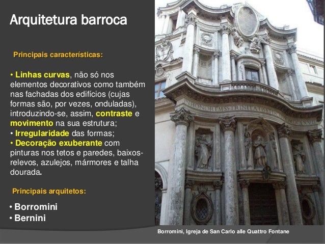 3. 3. Principais características:• Linhas curvas, não só noselementos decorativos como tambémnas fachadas dos edifícios (cujasformas são, por vezes, onduladas),introduzindo-se, assim, contraste emovimento na sua estrutura;• Irregularidade das formas;• Decoração exuberante compinturas nos tetos e paredes, baixos-relevos, azulejos, mármores e talhadourada.Principais arquitetos:• Borromini• Bernini Borromini, Igreja de San Carlo alle Quattro Fontane