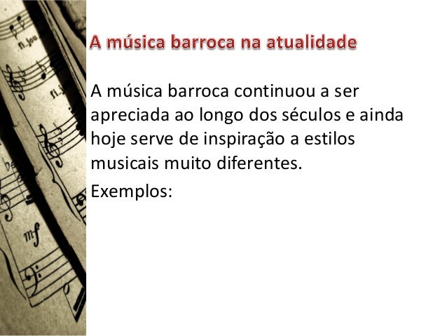 A música barroca continuou a serapreciada ao longo dos séculos e aindahoje serve de inspiração a estilosmusicais muito dif...