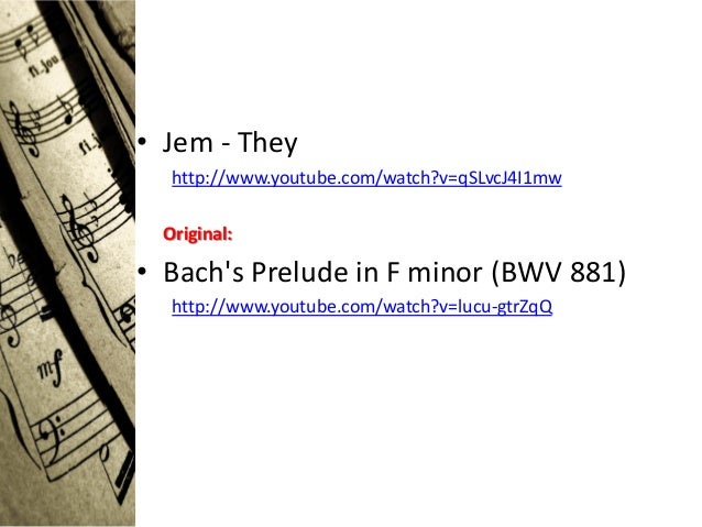 14. 14. • Jem - They http://www.youtube.com/watch?v=qSLvcJ4I1mw Original:• Bachs Prelude in F minor (BWV 881) http://www.youtube.com/watch?v=lucu-gtrZqQ