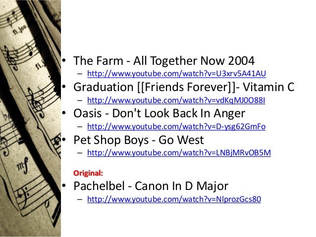 16. 16. • The Farm - All Together Now 2004 – http://www.youtube.com/watch?v=U3xrv5A41AU• Graduation [[Friends Forever]]- Vitamin C – http://www.youtube.com/watch?v=vdKqMJ0O88I• Oasis - Dont Look Back In Anger – http://www.youtube.com/watch?v=D-ysg62GmFo• Pet Shop Boys - Go West – http://www.youtube.com/watch?v=LNBjMRvOB5M Original:• Pachelbel - Canon In D Major – http://www.youtube.com/watch?v=NlprozGcs80