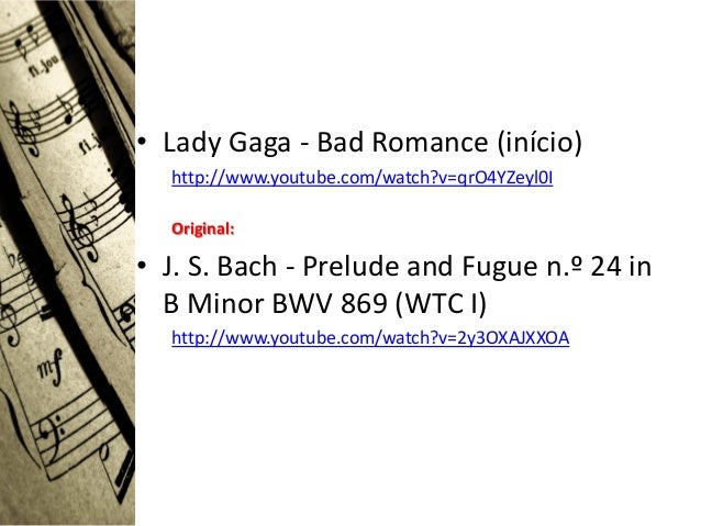 17. 17. • Lady Gaga - Bad Romance (início) http://www.youtube.com/watch?v=qrO4YZeyl0I Original:• J. S. Bach - Prelude and Fugue n.º 24 in B Minor BWV 869 (WTC I) http://www.youtube.com/watch?v=2y3OXAJXXOA