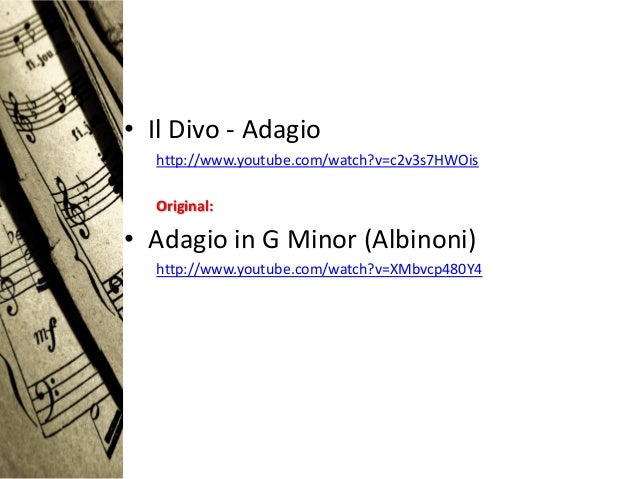 19. 19. • Il Divo - Adagio http://www.youtube.com/watch?v=c2v3s7HWOis Original:• Adagio in G Minor (Albinoni) http://www.youtube.com/watch?v=XMbvcp480Y4