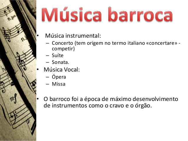 3. 3. • Música instrumental: – Concerto (tem origem no termo italiano «concertare» - competir) – Suíte – Sonata.• Música Vocal: – Ópera – Missa• O barroco foi a época de máximo desenvolvimento de instrumentos como o cravo e o órgão.