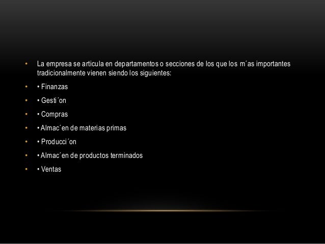 8. 8. • La empresa se articula en departamentos o secciones de los que los m´as importantestradicionalmente vienen siendo los siguientes:• • Finanzas• • Gesti´on• • Compras• • Almac´en de materias primas• • Producci´on• • Almac´en de productos terminados• • Ventas