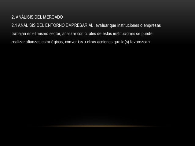 11. 11. 2. ANÁLISIS DEL MERCADO2.1 ANÁLISIS DEL ENTORNO EMPRESARIAL, evaluar que instituciones o empresastrabajan en el mismo sector, analizar con cuales de estás instituciones se puederealizar alianzas estratégicas, convenios u otras acciones que le(s) favorezcan