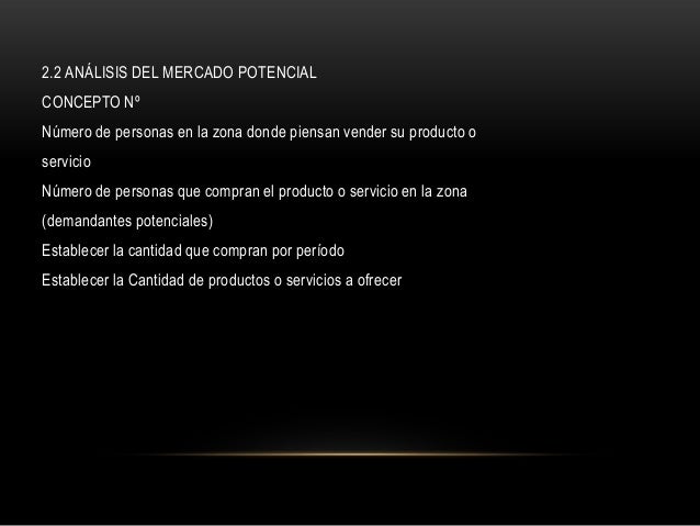 12. 12. 2.2 ANÁLISIS DEL MERCADO POTENCIALCONCEPTO NºNúmero de personas en la zona donde piensan vender su producto oservicioNúmero de personas que compran el producto o servicio en la zona(demandantes potenciales)Establecer la cantidad que compran por períodoEstablecer la Cantidad de productos o servicios a ofrecer