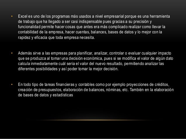 2. 2. • Excel es uno de los programas más usados a nivel empresarial porque es una herramientade trabajo que ha llegado a ser casi indispensable pues gracias a su precisión yfuncionalidad permite hacer cosas que antes era más complicado realizar como llevar lacontabilidad de la empresa, hacer cuentas, balances, bases de datos y lo mejor con larapidez y eficacia que toda empresa necesita.• Además sirve a las empresas para planificar, analizar, controlar o evaluar cualquier impactoque se produzca al tomar una decisión económica, pues si se modifica el valor de algún datocalcula inmediatamente cuál seria el valor del nuevo resultado, permitiendo analizar lasdiferentes posibilidades y así poder tomar la mejor decisión.• En todo tipo de tareas financieras y contables como por ejemplo proyecciones de créditos,creación de presupuestos, elaboración de balances, nóminas, etc. También en la elaboraciónde bases de datos y estadísticas