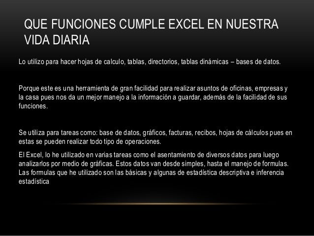 3. 3. QUE FUNCIONES CUMPLE EXCEL EN NUESTRAVIDA DIARIALo utilizo para hacer hojas de calculo, tablas, directorios, tablas dinámicas – bases de datos.Porque este es una herramienta de gran facilidad para realizar asuntos de oficinas, empresas yla casa pues nos da un mejor manejo a la información a guardar, además de la facilidad de susfunciones.Se utiliza para tareas como: base de datos, gráficos, facturas, recibos, hojas de cálculos pues enestas se pueden realizar todo tipo de operaciones.El Excel, lo he utilizado en varias tareas como el asentamiento de diversos datos para luegoanalizarlos por medio de gráficas. Estos datos van desde simples, hasta el manejo de formulas.Las formulas que he utilizado son las básicas y algunas de estadística descriptiva e inferenciaestadística