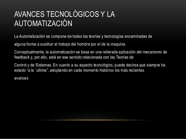 5. 5. AVANCES TECNOLÓGICOS Y LAAUTOMATIZACIÓNLa Automatización se compone de todas las teorías y tecnologías encaminadas dealguna forma a sustituir el trabajo del hombre por el de la maquina.Conceptualmente, la automatización se basa en una reiterada aplicación del mecanismo defeedback y, por ello, está en ese sentido relacionada con las Teorías deControl y de Sistemas. En cuanto a su aspecto tecnológico, puede decirse que siempre haestado “a la ´ultima”, adoptando en cada momento histórico los más recientesavances