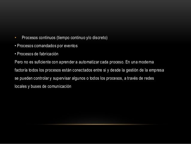 6. 6. • Procesos continuos (tiempo continuo y/o discreto)• Procesos comandados por eventos• Procesos de fabricaciónPero no es suficiente con aprender a automatizar cada proceso. En una modernafactoría todos los procesos están conectados entre si y desde la gestión de la empresase pueden controlar y supervisar algunos o todos los procesos, a través de redeslocales y buses de comunicación