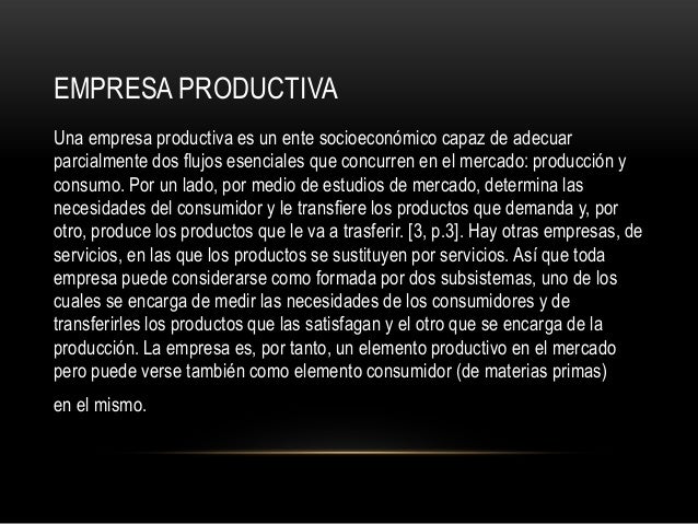 7. 7. EMPRESA PRODUCTIVAUna empresa productiva es un ente socioeconómico capaz de adecuarparcialmente dos flujos esenciales que concurren en el mercado: producción yconsumo. Por un lado, por medio de estudios de mercado, determina lasnecesidades del consumidor y le transfiere los productos que demanda y, porotro, produce los productos que le va a trasferir. [3, p.3]. Hay otras empresas, deservicios, en las que los productos se sustituyen por servicios. Así que todaempresa puede considerarse como formada por dos subsistemas, uno de loscuales se encarga de medir las necesidades de los consumidores y detransferirles los productos que las satisfagan y el otro que se encarga de laproducción. La empresa es, por tanto, un elemento productivo en el mercadopero puede verse también como elemento consumidor (de materias primas)en el mismo.