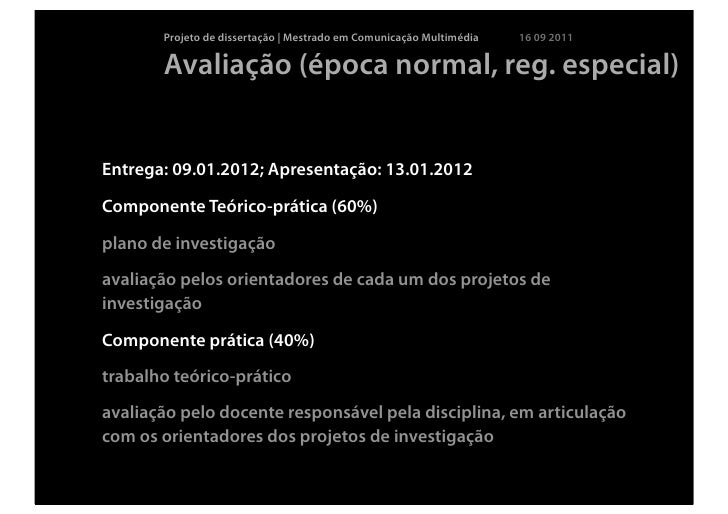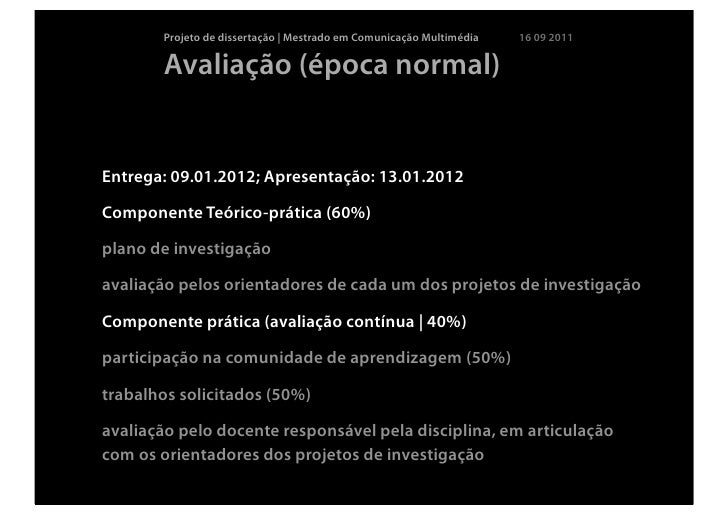 12. 12. Projeto de dissertação | Mestrado em Comunicação Multimédia 16 09 2011 Avaliação (época normal)Entrega: 09.01.2012; Apresentação: 13.01.2012Componente Teórico-prática (60%)plano de investigaçãoavaliação pelos orientadores de cada um dos projetos de investigaçãoComponente prática (avaliação contínua | 40%)participação na comunidade de aprendizagem (50%)trabalhos solicitados (50%)avaliação pelo docente responsável pela disciplina, em articulaçãocom os orientadores dos projetos de investigação