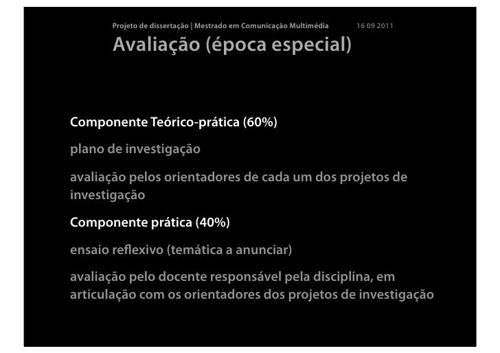 15. 15. Projeto de dissertação | Mestrado em Comunicação Multimédia 16 09 2011 Avaliação (época especial)Componente Teórico-prática (60%)plano de investigaçãoavaliação pelos orientadores de cada um dos projetos deinvestigaçãoComponente prática (40%)ensaio reflexivo (temática a anunciar)avaliação pelo docente responsável pela disciplina, emarticulação com os orientadores dos projetos de investigação