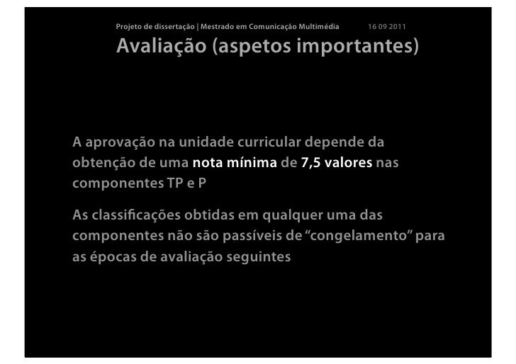 16. 16. Projeto de dissertação | Mestrado em Comunicação Multimédia 16 09 2011 Avaliação (aspetos importantes)A aprovação na unidade curricular depende daobtenção de uma nota mínima de 7,5 valores nascomponentes TP e PAs classificações obtidas em qualquer uma dascomponentes não são passíveis de “congelamento” paraas épocas de avaliação seguintes
